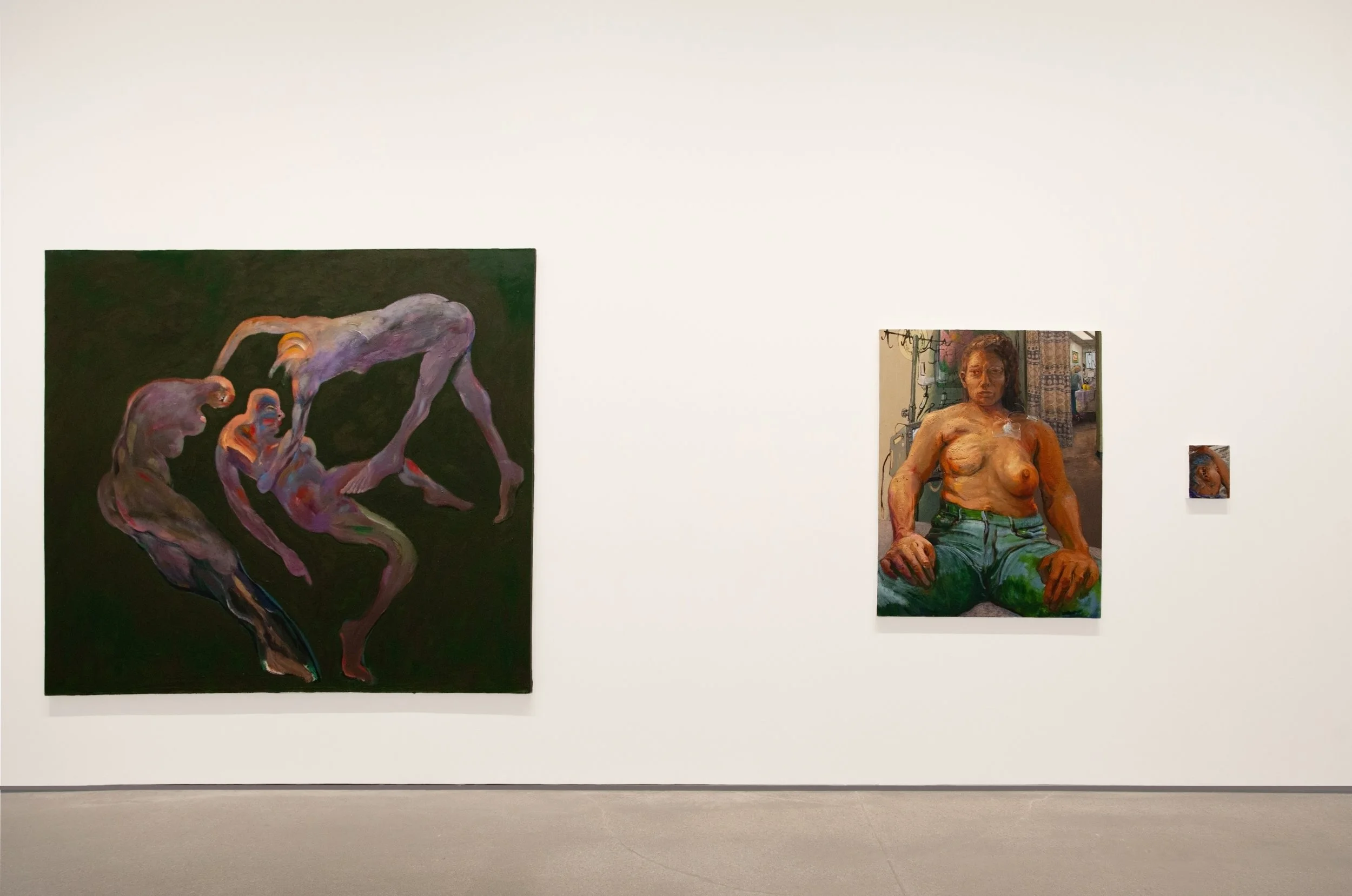 While we view this ongoing experience from very different perspectives, our work in this exhibition aims to push against the overly simplistic stereotypes primarily attached to cancer patients and caregiving more generally. The paintings utilize gesture, distortion, and the quality of oil paint itself to translate our often-conflicting sensations of grief, hope, pain, love, fatigue, bodily absurdity, and more.